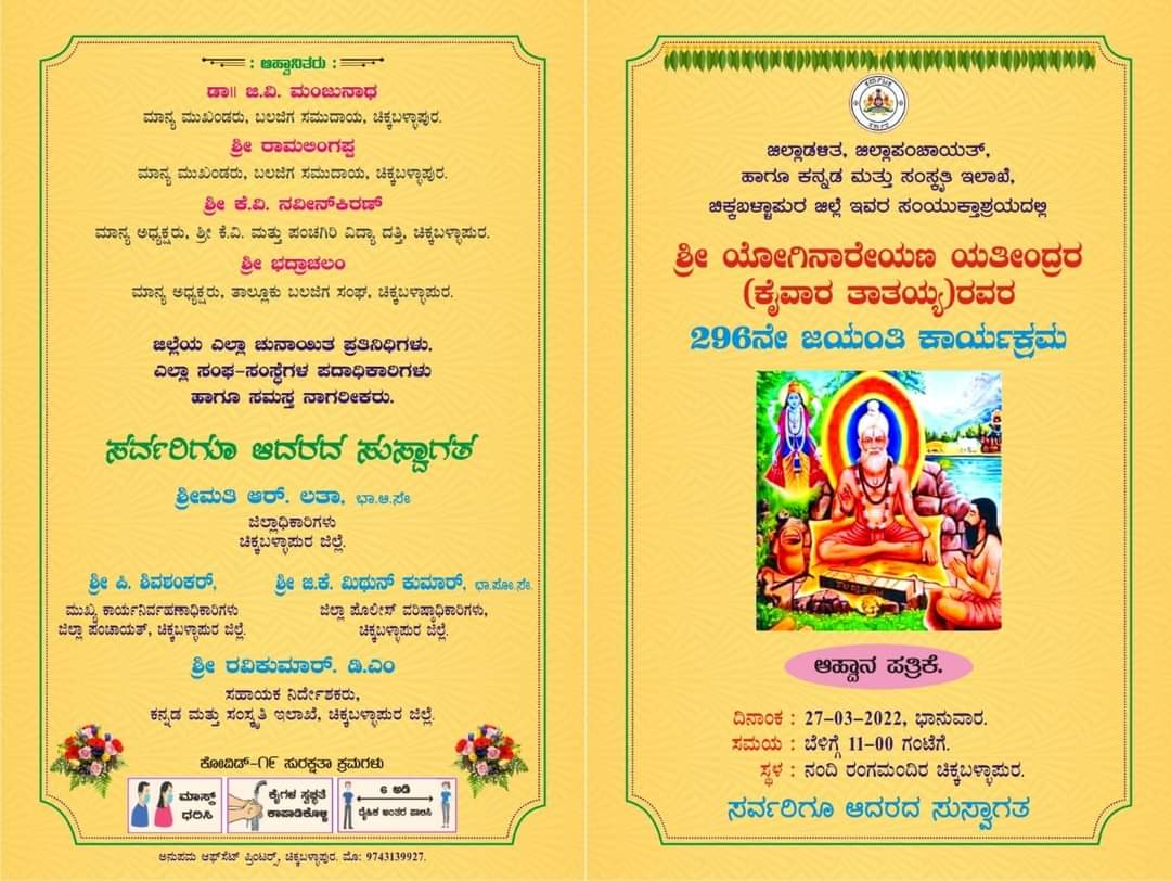 ಚಿಕ್ಕಬಳ್ಳಾಪುರ: ಇದೇ ಮೊದಲ ಬಾರಿಗೆ ರಾಜ್ಯ ಸರ್ಕಾರದಿಂದ ಮಾ.27ರಂದು ಆಚರಿಸುತ್ತಿರುವ ಕೈವಾರ ತಾತಯ್ಯನವರ 296ನೇ ಜಯಂತಿ ಕಾರ್ಯಕ್ರಮದ ಆಹ್ವಾನ ಪತ್ರಿಕೆಯಲ್ಲಿ ಸಮುದಾಯದ ಹೆಸರನ್ನೇ ತಪ್ಪಾಗಿ ಪ್ರಕಟಿಸಲಾಗಿದೆ.