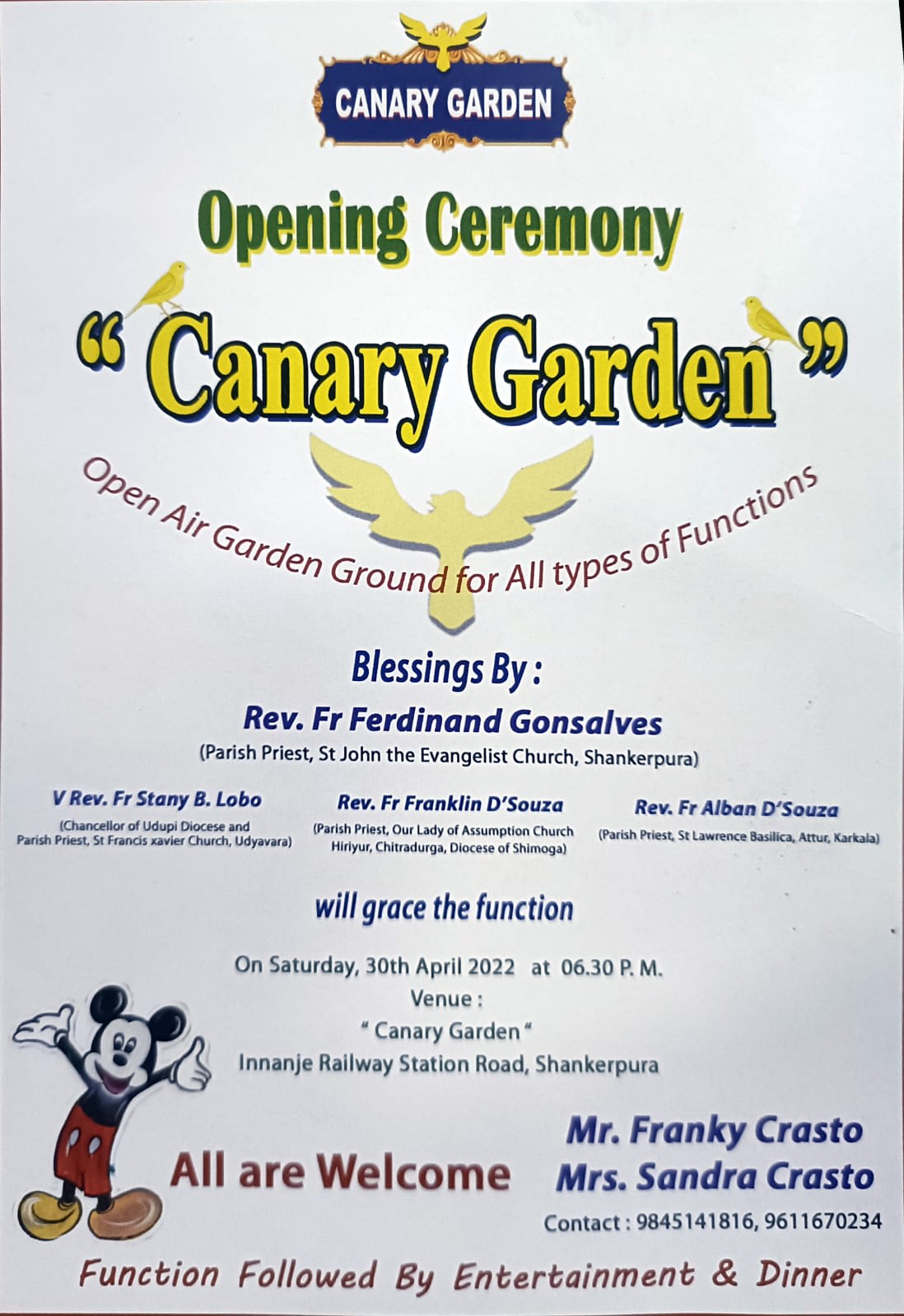 ಶಿರ್ವ: ಶಿರ್ವ ಶಂಕರಪುರದ ಇನ್ನಂಜೆ ರೈಲ್ವೆ ನಿಲ್ದಾಣ ರಸ್ತೆಯ ಸಮೀಪ ನಿರ್ಮಾಣಗೊಂಡ ನೂತನ ಕೆನರಿ ಗಾರ್ಡನ್ ಮೈದಾನದ ಉದ್ಘಾಟನಾ ಸಮಾರಂಭವು ಏ.30ರ ಸಂಜೆ 6.30ಕ್ಕೆ ಜರುಗಲಿದೆ.