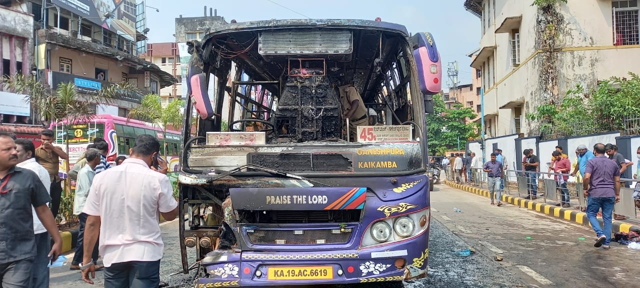 ಮಂಗಳೂರು: ಖಾಸಗಿ ಬಸ್ಸೊಂದಕ್ಕೆ ಬೈಕ್ ಡಿಕ್ಕಿ ಹೊಡೆದ ಪರಿಣಾಮ ನಡುರಸ್ತೆಯಲ್ಲೇ ಬಸ್ ಹಾಗೂ ಬೈಕ್ ಹೊತ್ತಿ ಉರಿದ ಘಟನೆ ಮಂಗಳೂರು ನಗರದ ಹಂಪನಕಟ್ಟೆ ವೃತ್ತದ ಬಳಿ ಗುರುವಾರ ನಡೆದಿದೆ.