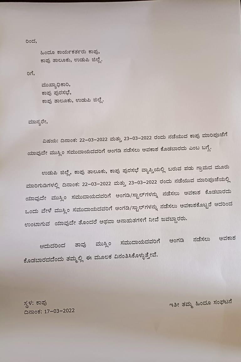 ಈ ಮನವಿ ಪತ್ರದಲ್ಲಿ ಕಾಪು ಪುರಸಭೆ ವ್ಯಾಪ್ತಿಗೆ ಬರುವ ಪಡು ಗ್ರಾಮದ ಮೂರು ಮಾರಿಗುಡಿಗಳಲ್ಲಿ ಮಾ.22 ಮತ್ತು ಮಾ.23ರಂದು ನಡೆಯುವ ಮಾರಿಪೂಜೆಯಲ್ಲಿ ಯಾವುದೇ ಮುಸ್ಲಿಂ ಸಮುದಾಯದವರಿಗೆ ಅಂಗಡಿ/ಸ್ಟಾಲ್ಗಳನ್ನು ನಡೆಸಲು ಅವಕಾಶ ಕೊಡಬಾರದು. ಒಂದು ವೇಳೆ ಮುಸ್ಲಿಂ ಸಮುದಾಯದವರಿಗೆ ಅಂಗಡಿ/ಸ್ಟಾಲ್ಗಳನ್ನು ನಡೆಸಲು ಅವಕಾಶಕೊಟ್ಟರೆ ಅದರಿಂದ ಉಂಟಾಗುವ ಯಾವುದೇ ತೊಂದರೆ ಅಥವಾ ಅನಾಹುತಗಳಿಗೆ ನೀವೆ ಜವಾಬ್ದಾರರು. ಆದುದರಿಂದ ತಾವು ಮುಸ್ಲಿಂ ಸಮುದಾಯದವರಿಗೆ ಅಂಗಡಿ ನಡೆಸಲು ಅವಕಾಶ ಕೊಡಬಾರದದೆಂದು ವಿನಂತಿಸಿಕೊಳ್ಳುತ್ತೇವೆ ಎಂದು ಉಲ್ಲೇಖಿಸಲಾಗಿದೆ.