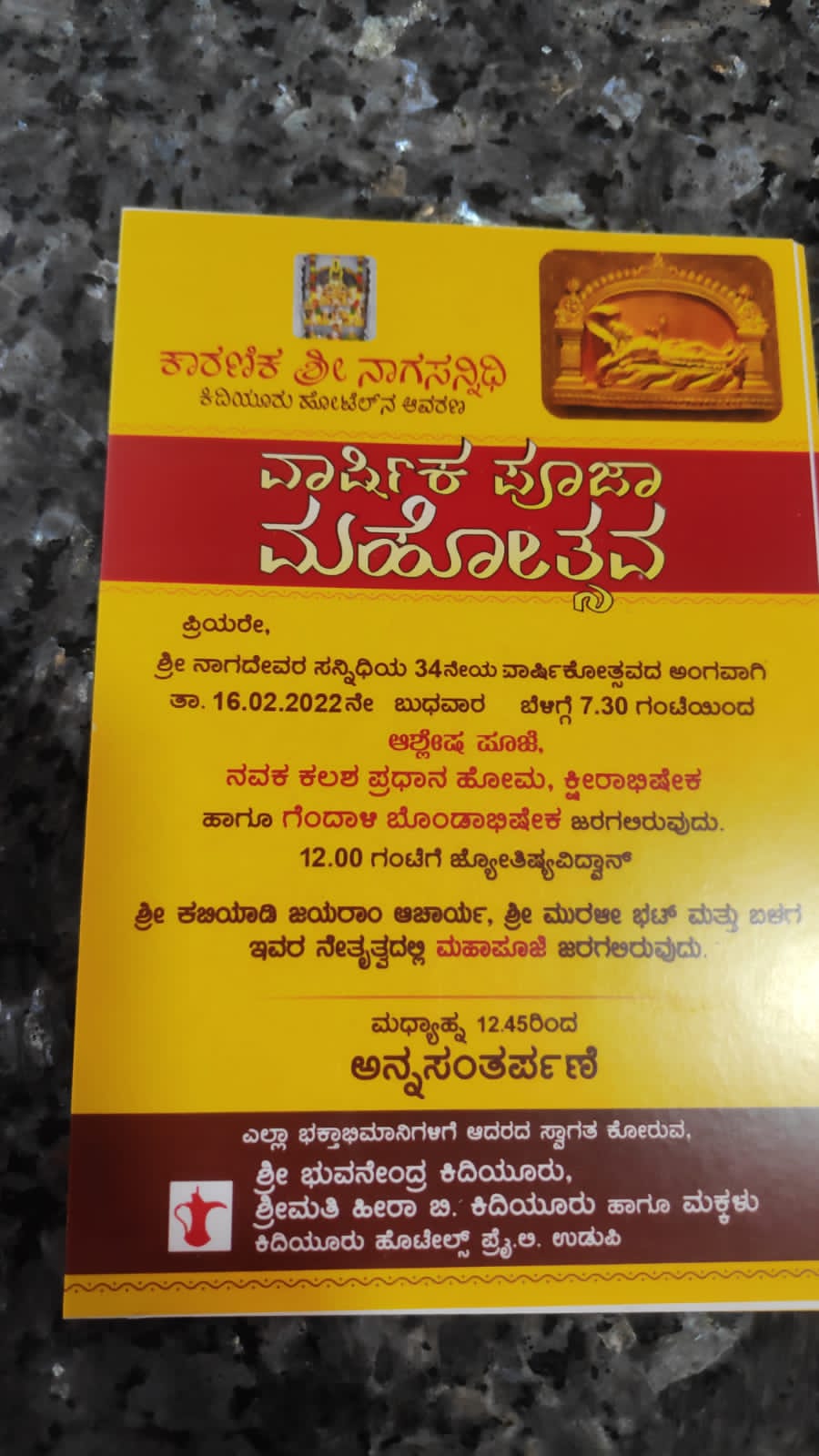 ಉಡುಪಿ: ಕಿದಿಯೂರು ಹೋಟೆಲ್ ನ ಆವರಣದಲ್ಲಿರುವ ನಾಗದೇವರ ಸನ್ನಿಧಿಯ 34ನೇಯ ವಾರ್ಷಿಕೋತ್ಸವದ ಅಂಗವಾಗಿ ಕಿದಿಯೂರು ಹೋಟೆಲ್ಸ್ ಪ್ರೈ.ಲಿ. ಉಡುಪಿ ಅವರು ಫೆ.16ರಂದು ವಾರ್ಷಿಕ ಪೂಜಾ ಮಹೋತ್ಸವವನ್ನು ಆಯೋಜಿಸಿದ್ದಾರೆ.
