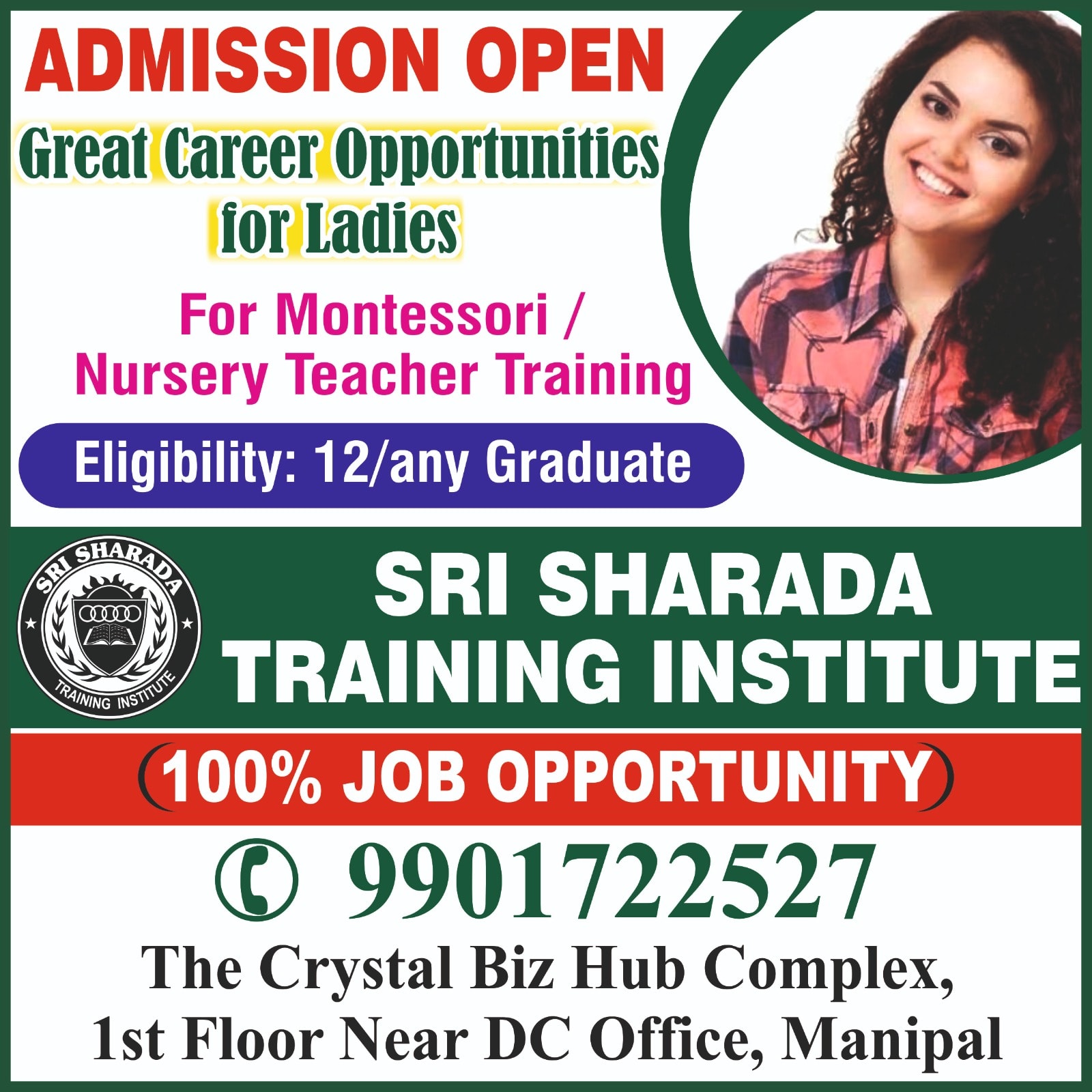 ಮಣಿಪಾಲ: ಕಳೆದ 10 ವರ್ಷಗಳಿಂದ ‘ಶ್ರೀ ಶಾರದ ಟೀಚರ್ ಟ್ರೈನಿಂಗ್ ಇನ್ಸ್ಟಿಟ್ಯೂಟ್’, ಮಹಿಳೆಯರಿಗೆ ಒಂದು ವರ್ಷದ ಮಾಂಟೆಸ್ಸರಿ / ನರ್ಸರಿ ಟೀಚರ್ಸ್ ಟ್ರೈನಿಂಗ್ ನಡೆಸುತ್ತಿದೆ.ಭಾರತ ಸರಕಾರದ ನಿರುದ್ಯೋಗ ನಿರ್ಮೂಲನ ಏಜೆನ್ಸಿಯಾದ ಭಾರತ್ ಸೇವಕ್ ಸಮಾಜ್ ಇದರ ಆಶ್ರಯದಲ್ಲಿ ನಡೆಸಲ್ಪಡುವ ಈ ಕೋರ್ಸಿಗೆ ಪ್ರವೇಶಾತಿ ಆರಂಭವಾಗಿದ್ದು, ಪಿಯುಸಿ ಮೇಲ್ಪಟ್ಟ ವಿದ್ಯಾರ್ಹತೆ ಹೊಂದಿದ ಮಹಿಳಾ ಆಭ್ಯರ್ಥಿಗಳು ಈ ತರಬೇತಿಯ ಪ್ರಯೋಜನೆ ಪಡೆದುಕೊಳ್ಳಬಹುದು.ಆಸಕ್ತರು ಸಂಸ್ಥೆಯಿಂದ ಅರ್ಜಿ ನಮೂನೆ ಪಡೆದು ಶ್ರೀ ಶಾರದಾ ಟೀಚರ್ ಟ್ರೈನಿಂಗ್, ಡಿ.ಸಿ. ಆಫೀಸ್ ಬಳಿ, ಕ್ರಿಸ್ಟಲ್ ಬಿಜ್ಹ್ ಹಬ್, 1ನೇ ಮಹಡಿಯಲ್ಲಿರುವ ಸಂಸ್ಥೆಯಲ್ಲಿ ಅರ್ಜಿ ಸಲ್ಲಿಸಬಹುದು ಅಥವಾ 9901722527 ಗೆ ಕರೆ ಮಾಡಬಹುದು ಎಂದು ಸಂಸ್ಥೆಯ ಪ್ರಕಟಣೆ ತಿಳಿಸಿರುತ್ತದೆ.