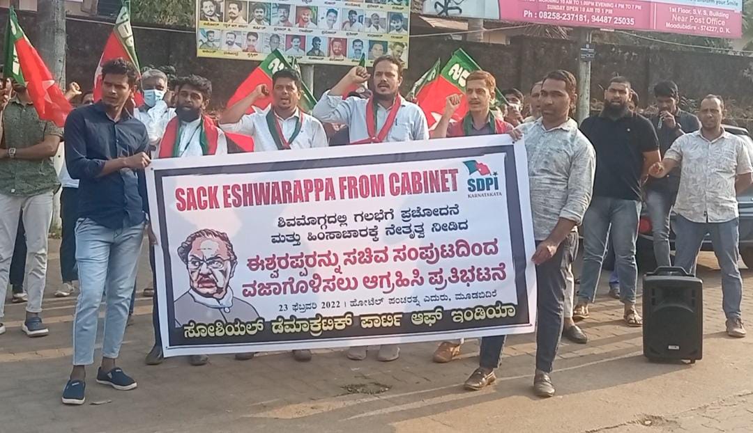 ಈಶ್ವರಪ್ಪ ಅವರನ್ನು ಸಚಿವ ಸಂಪುಟದಿಂದ ವಜಾಗೊಳಿಸಬೇಕೆಂದು ಆಗ್ರಹಿಸಿ ಎಸ್ಡಿಪಿಐ ವತಿಯಿಂದ ಮೂಡುಬಿದಿರೆಯಲ್ಲಿ ಬುಧವಾರ ಸಂಜೆ ನಡೆದ ಪ್ರತಿಭಟನಾ ಸಭೆಯನ್ನುದ್ದೇಶಿಸಿ ಮಾತನಾಡಿದರು.